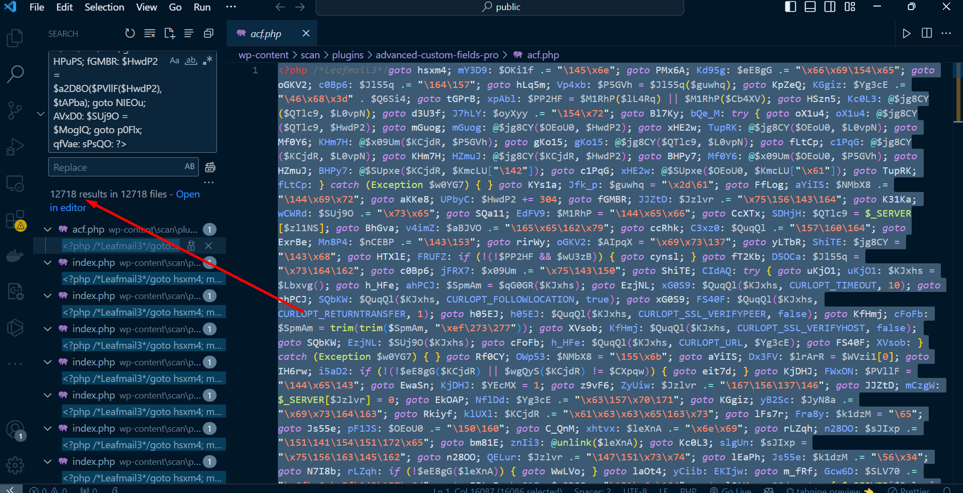 Ctrl + Shift + F), I searched for the pattern<?php /*Leafmail3*/which was unique to the malware. - Select and Inspect the Results: VSCode highlighted all occurrences of the malware signature across the entire project. This step was crucial to ensure that the search query was accurate and not inadvertently affecting legitimate code.